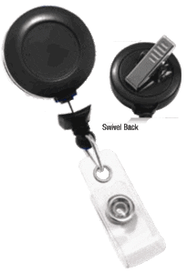 The Plastic round solid color reel with swivel clip, and clear vinyl strap with “No-Twist” bullet that keeps badge facing forward.