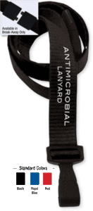 “5/8″ Anti-Microbial Lanyards” The anti-microbial lanyard material contains particles which coat fibers, inhibit the growth of germs, and kill odor causing bacteria. Ideal for food service, healthcare and other industries that need to have clean environments. Lanyard is completely washable. We customize our lanyards with water based links.