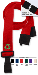 “Made of 100% P.E.T. Recycled Plastic!” 3/8″” or 5/8″ width Polyethylene recycled plastic with recycled plastic hook and safety break-always. Recycled plastic means less petroleum – a finite commodity – is consumed. We customize our lanyards with water based inks.